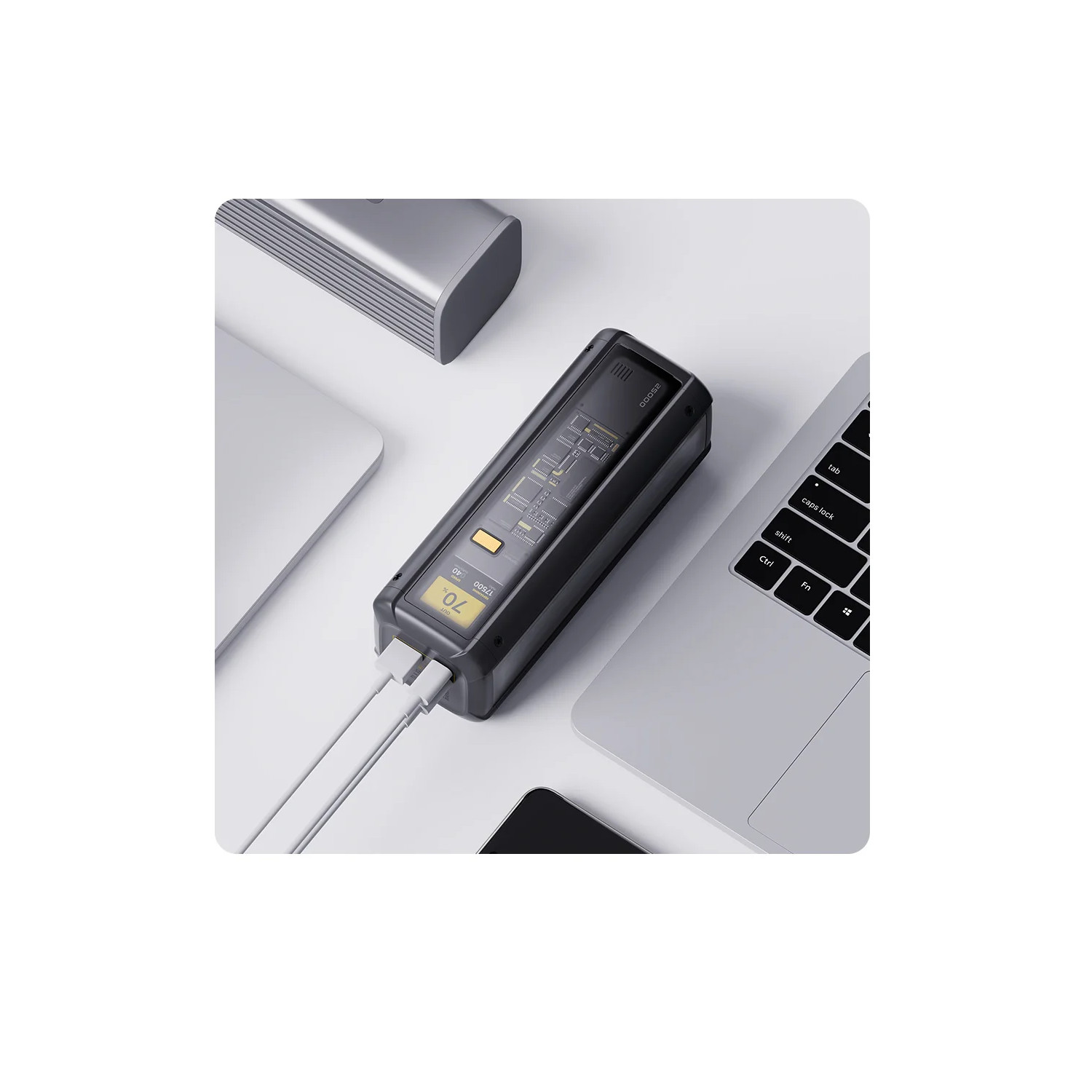 Průhledný design dodává powerbance hi-tech vzhled.Powerbanka se dobře drží díky zaoblenému tělu.