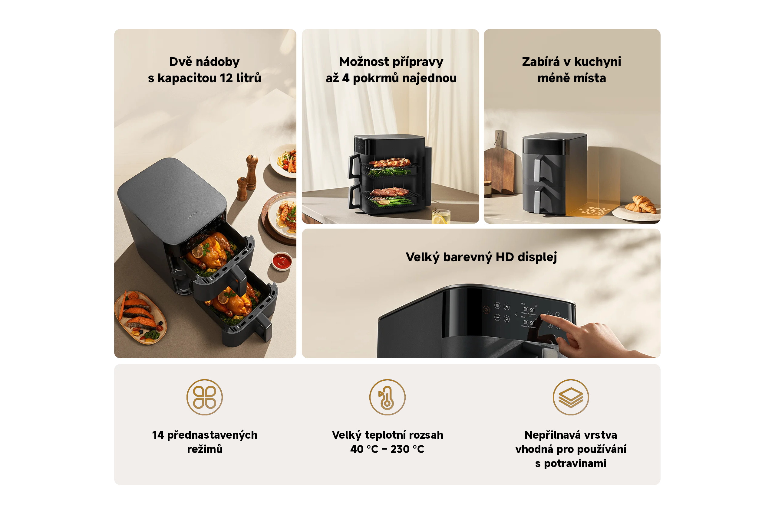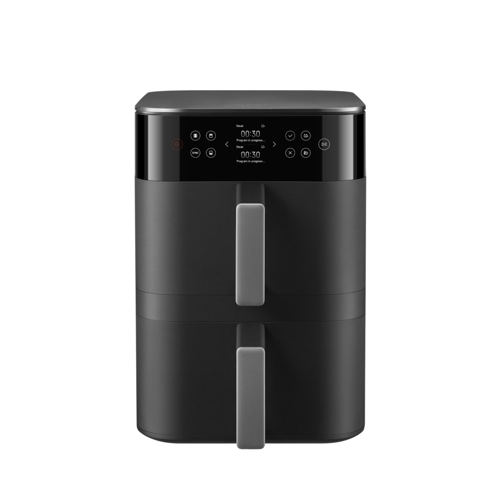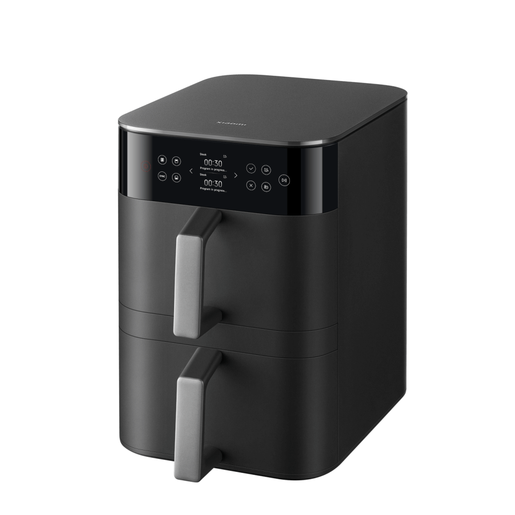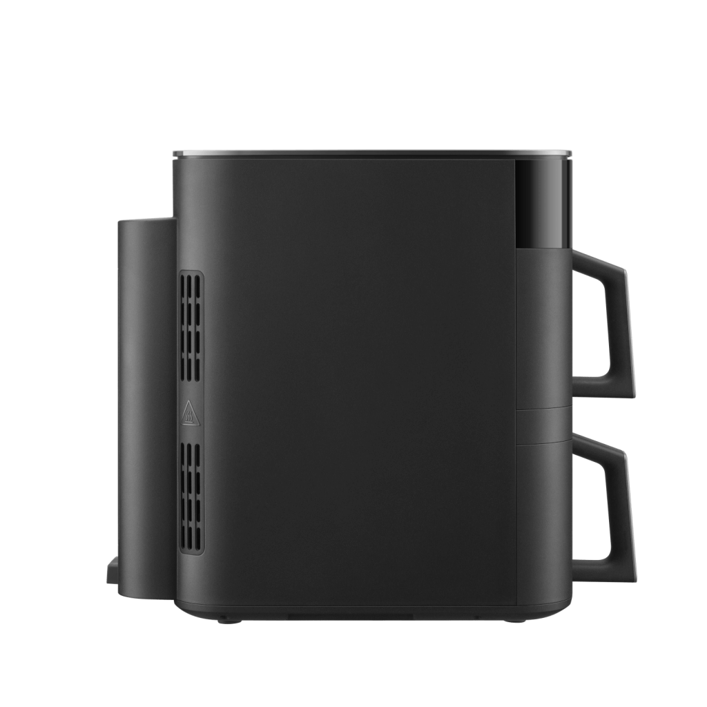 Vertikální uspořádání dvou nádob je prostorově efektivnější než jejich umístění vedle sebe. Tato horkovzdušná fritéza ušetří přibližně 35 % místa v porovnání s modelem Xiaomi Dual Zone Air Fryer 10 l.