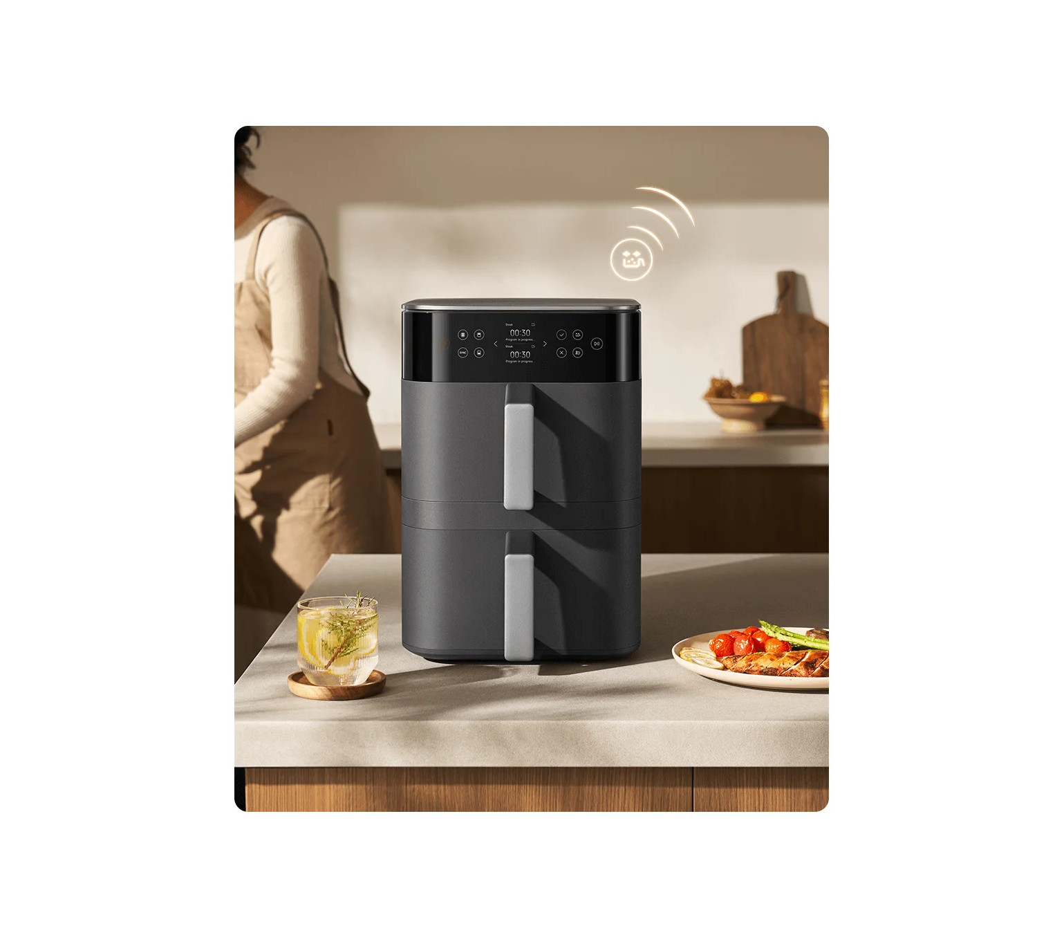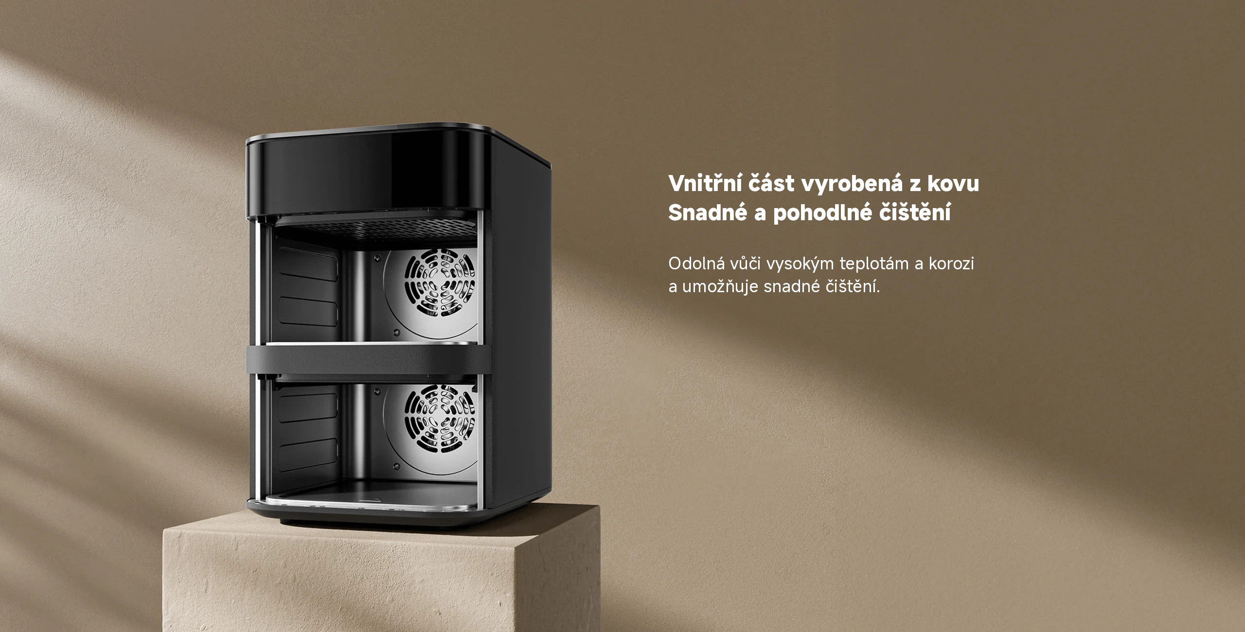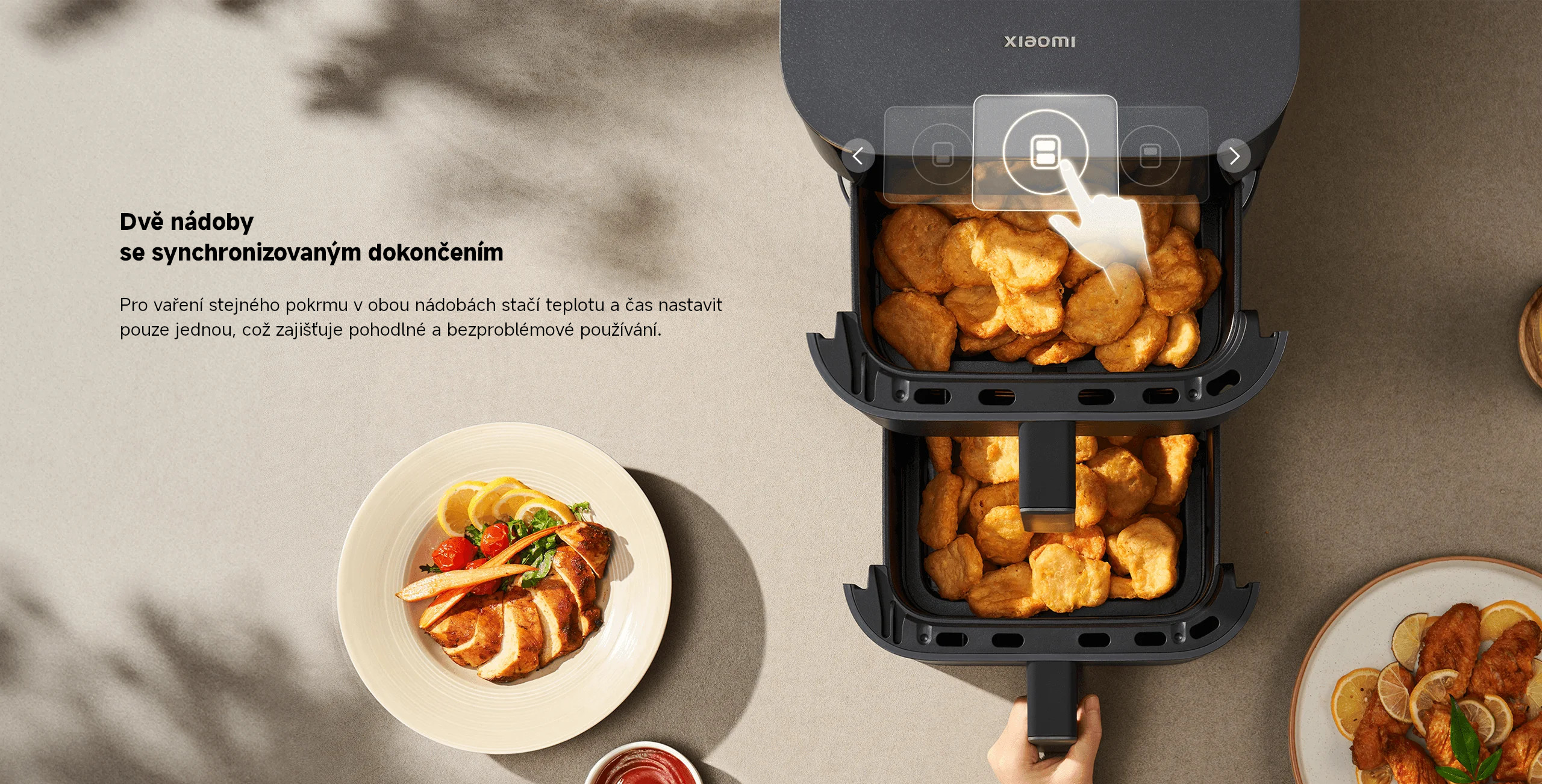 Vertikální uspořádání dvou nádob je prostorově efektivnější než jejich umístění vedle sebe. Tato horkovzdušná fritéza ušetří přibližně 35 % místa v porovnání s modelem Xiaomi Dual Zone Air Fryer 10 l.