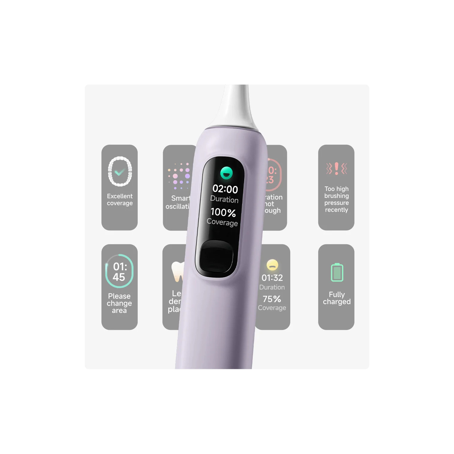 Kartáček je vybaven vestavěným algoritmem, který analyzuje nedávné chování při čištění zubů.Displej se probudí, když kartáček zvednete, takže můžete sledovat stav čištění zubů a lépe se zaměřit na čištění.