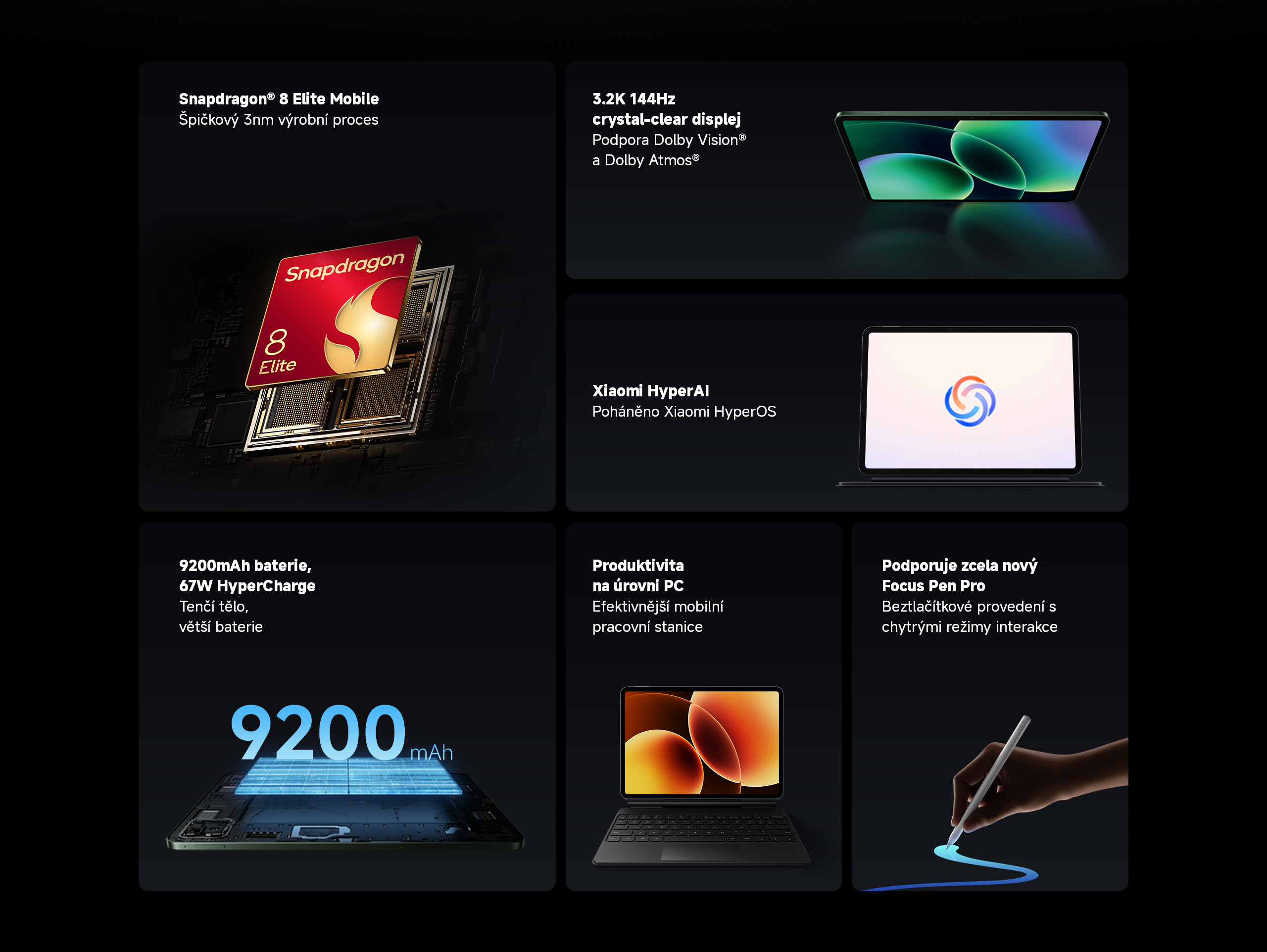 Xiaomi Pad 8 Pro pohání mobilní platforma Snapdragon® 8 Elite. Je postavena na 2. generaci 3nm procesu TSMC a využívá architekturu Qualcomm se dvěma hlavními jádry (Dual Prime-Core). Přináší tak dramatický nárůst výkonu a schopnosti na úrovni PC – hravě si poradí s komplexním multitaskingem, obrovskými objemy dat i graficky nejnáročnějšími hrami.