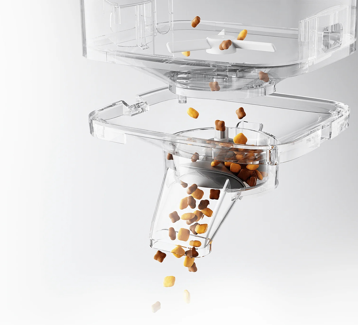 Oddělitelná konstrukce těla podavače umožňuje rychlou demontáž nádoby na krmivo ve dvou krocích pro bezpečné umytí.